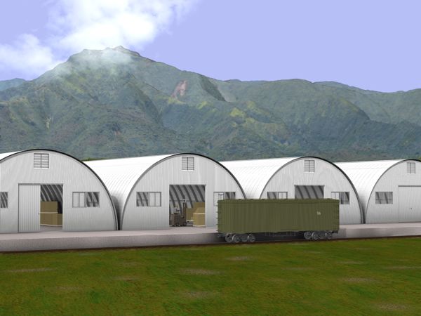 A prominent sight along Kahului Beach Road from the mid 1940's and into the 1980's was a warehouse complex consisting of 40 utility buildings (large version of the quonset hut), four of which are shown above. The buildings had a floor area of 40' x 100' and were shaped like half cylinders. The side facing the beach was serviced by a railroad siding and the opposite side could be serviced by trucks as shown in the map below.