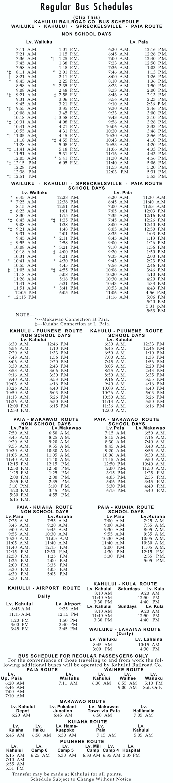 This is a replica (type reset using similar fonts of the published schedule) of the Kahului Railroad Co. Bus Schedule which appeared in the April 3, 1943 issue of The Maui News. There are consistency problems (A.M./P.M. on most of the schedule but AM/PM at the bottom) and spacing problems which are preserved to get the look and feel of the schedule. The available microfilm copy of newspaper was difficult to read and resetting the type was less work than photo-editing the image. The actual width of the time table was two columns (about 3-1/2 inches).